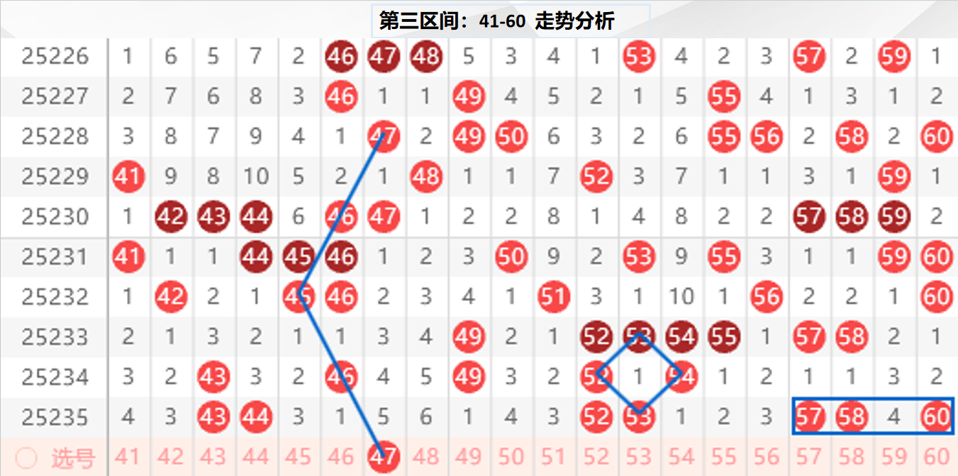 三区分析:【41-60】(走势图标注号码非小黄车大底,请谨慎参考,具体思路将在直播间分享讨论)