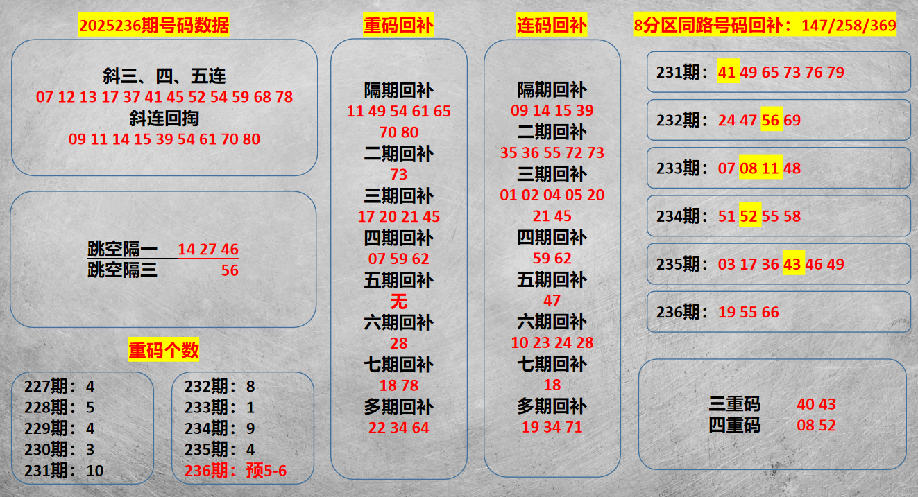 上期三区的整体开号中在区间的三同路出号上保持着重点,形态上一重一分边一放空的模式再次出现,且区间也是维持热度继续爆区开号。以区间当前的出号周期上判断机会,首先还是要关注在同形态下方做43 52的布局,以及在43 44、52 53、57 58的三组连号下方考虑出号的重点,两种形态上首先关注在重码的出号选择,这里可重点考虑在后区三同路上的出号重点,区间和周期在三同路的出号表现中开出重码的可能性比较大,但在43 52结合同尾的组合判断中也要防守这里的出号可能,区间在同尾的组合中当前也是保持着不放空的回补,以周期和区间的重码形态上考虑,43 52中也要关注择一的布局选择。区间在空位的回补强势,且在空位的小周期上同样保持着出号的重点,对应本期的空位回补的位置上判断机会,46 49 50 55的四码中还是要考虑出号上的选择,以放空形态的回补考虑重点,侧重在46 49 50三码中的优先判断选择,接力周期回补出号的可能性上还是比较大的。
