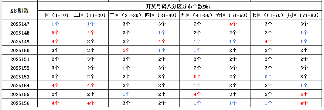 如图,红色字体是热号区,区间开出4个及以上号码。蓝色字体是冷号区,区间开出1个及以下号码。以近10期为一个分析周期,依据久热必冷,久冷必热的规律,本期重点关注:一区、二区、八区,区间可能开出3-4个号码。五区、六区、七区,区间可能开出1-2个号码。个人分析,仅供参考。