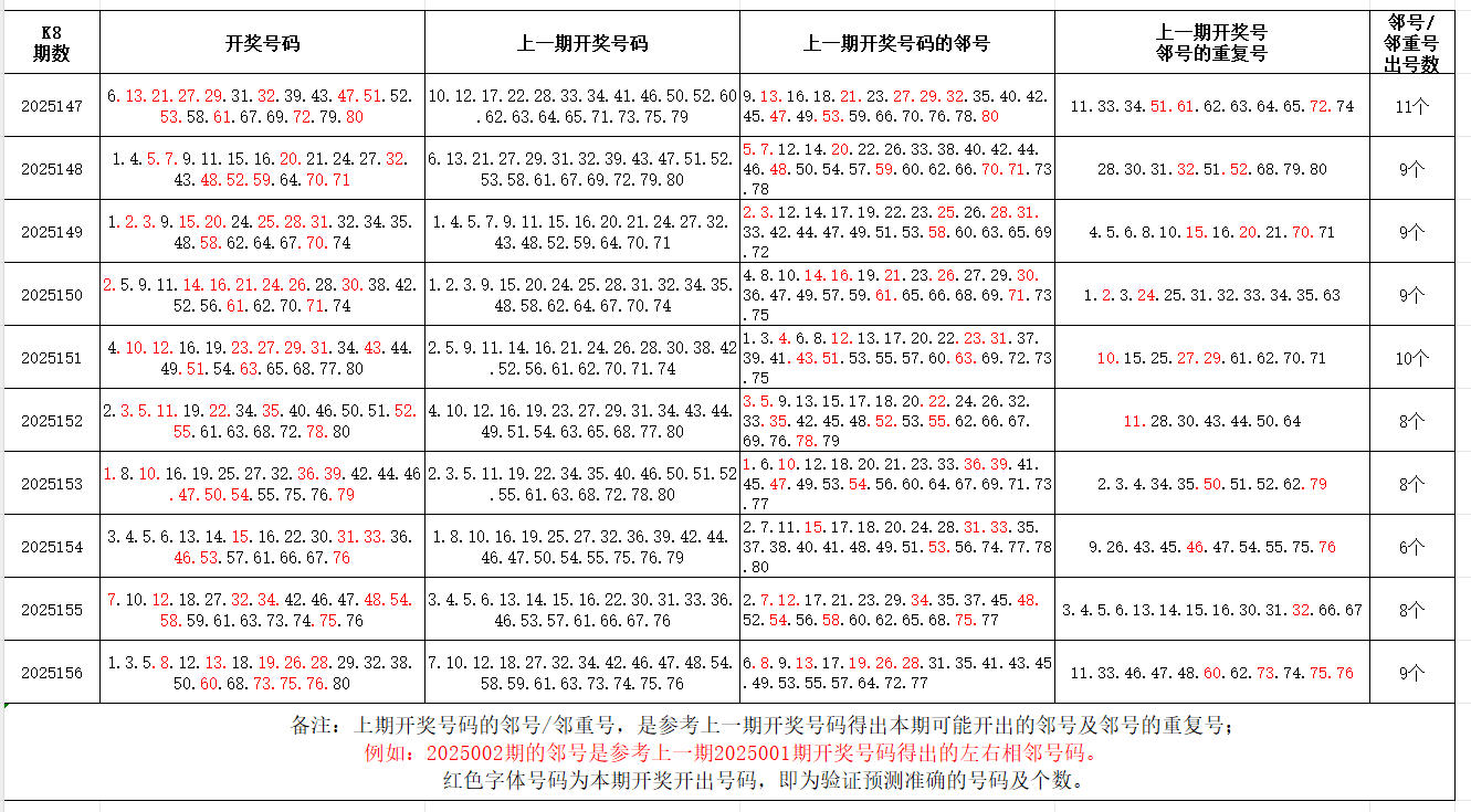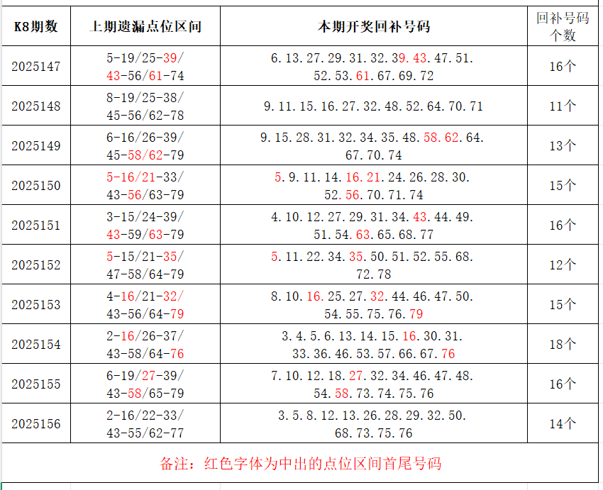 如图,上期的遗漏号码在下期开出10个左右,即为回补号码。定准点位区间首尾号码是关键!以上期2025156期(会员专区数据)为例,定位4个遗漏区间,围中14码!结合上期开奖号码,以跨度值大于或等于7为依据,本期关注4个遗漏区间:19-26/38-50/50-60/60-68;重点关注遗漏-区间:****(会员专区可见),区间遗漏号码可能在本期回补开出。注意区分遗漏区间回补号码和大底号码,不要混淆。个人分析,仅供参考。