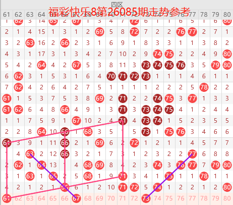 福彩快乐8是从01-80个号码中每期开出20个号码,我们把80个号码分为四个区:一区01-20号,二区21-40号,三区41-60号,四区61-80号