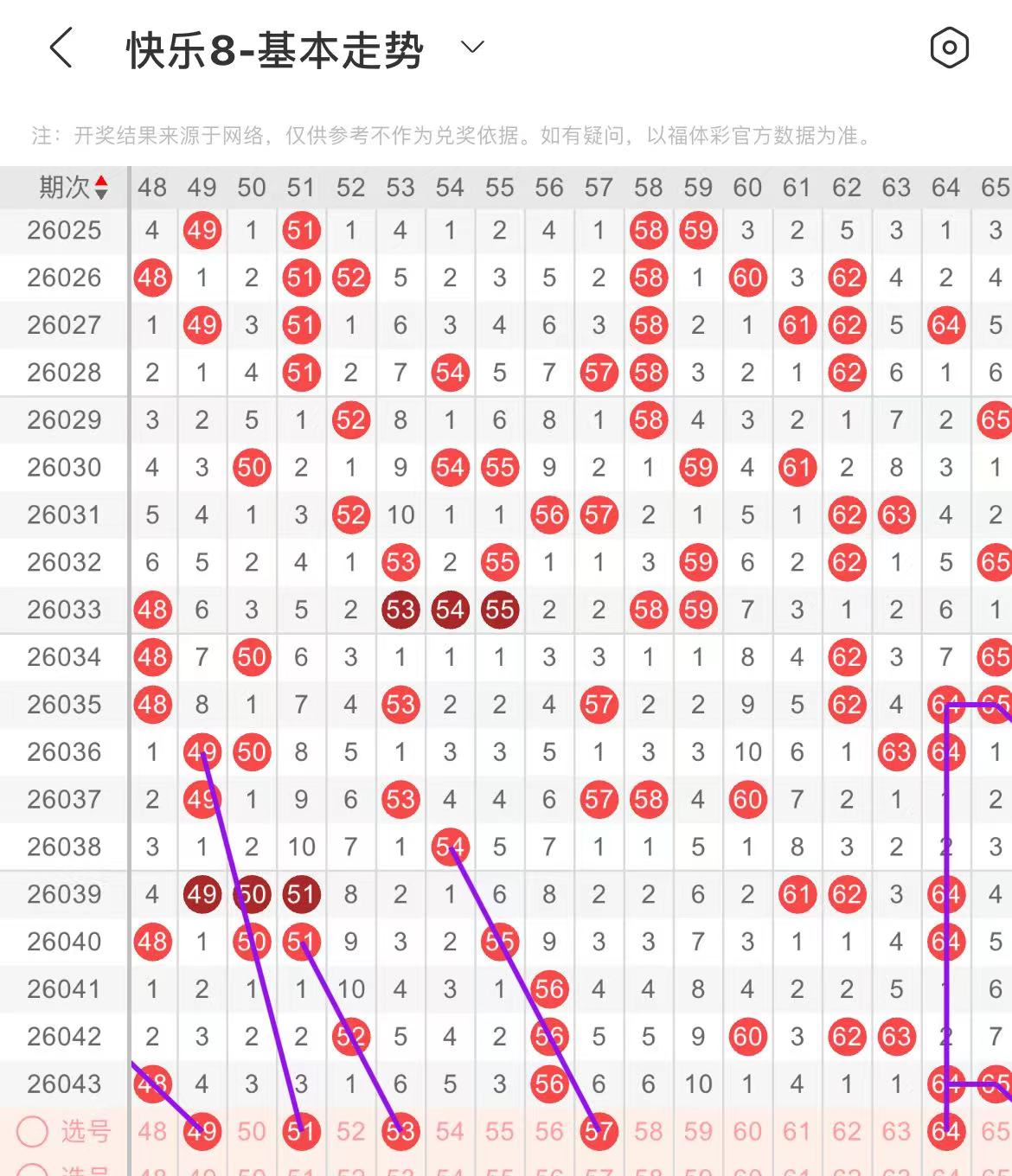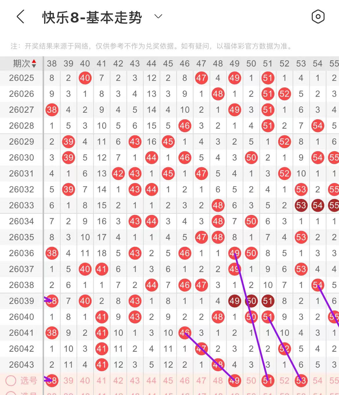41-50区:本区间上期开出了两个号码,从号码走势图上看,该区现属于温冷区,本期出号个数在一两个号码左右,有出号走势的号码有49号,四斜连出号走势,防43.49或者46.49同出。