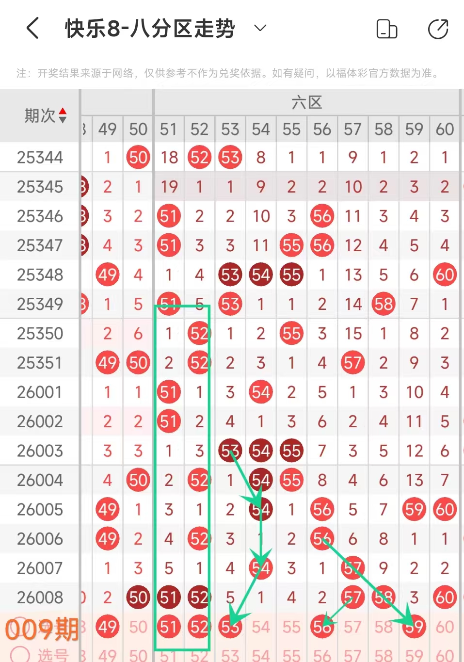 上期六区开出51 52 57 58这4个号码,本期应该出3个。