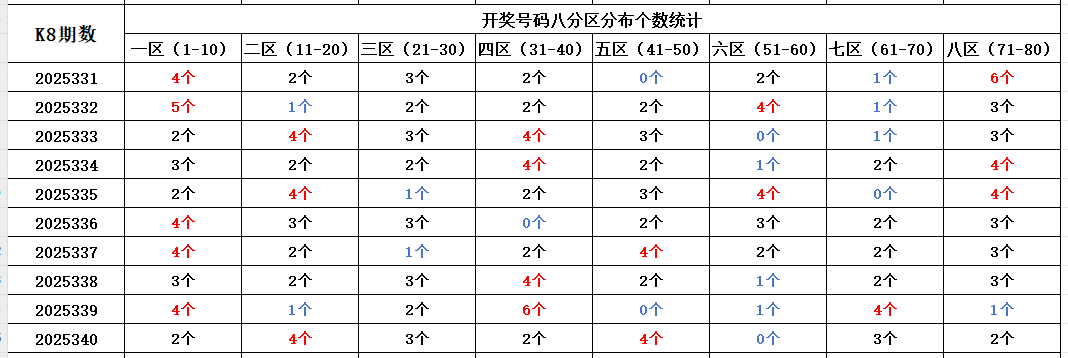 首先看上期回顾,“快乐8”第25340期开奖结果:1.9.14.15.16.20.21.24.29.31.40.45.46.47.49.63.65.68.71.74;通过分析开奖号码,分享第一个数据分析:统计开奖号码的八分区冷热走势,判断出号规律。以近10期开奖号码的八分区统计数据为例: