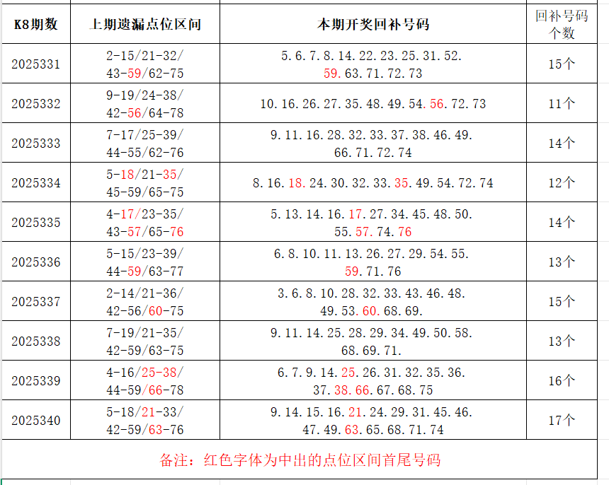 分享第二个数据分析:定位点位区间。上期开奖号码和邻号以外的号码,即为遗漏号码,大概率会在下期回补开出。以近10期回补点位区间的统计数据为例: