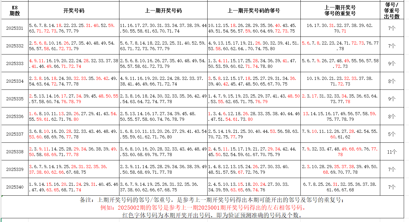 特别提示:关于邻号和邻重号的数据统计,邻号,是指上期开奖号码的左右相邻号码;其中重复出现的邻号,即为邻重号。一定要区分,邻重号不是上期开奖号码的重号,是邻号里的重号。可能新关注的粉丝,还不适应这种统计方法。熟能生巧,无它。统计方法不同,得到的数据结果不同。个人分析,仅供参考。