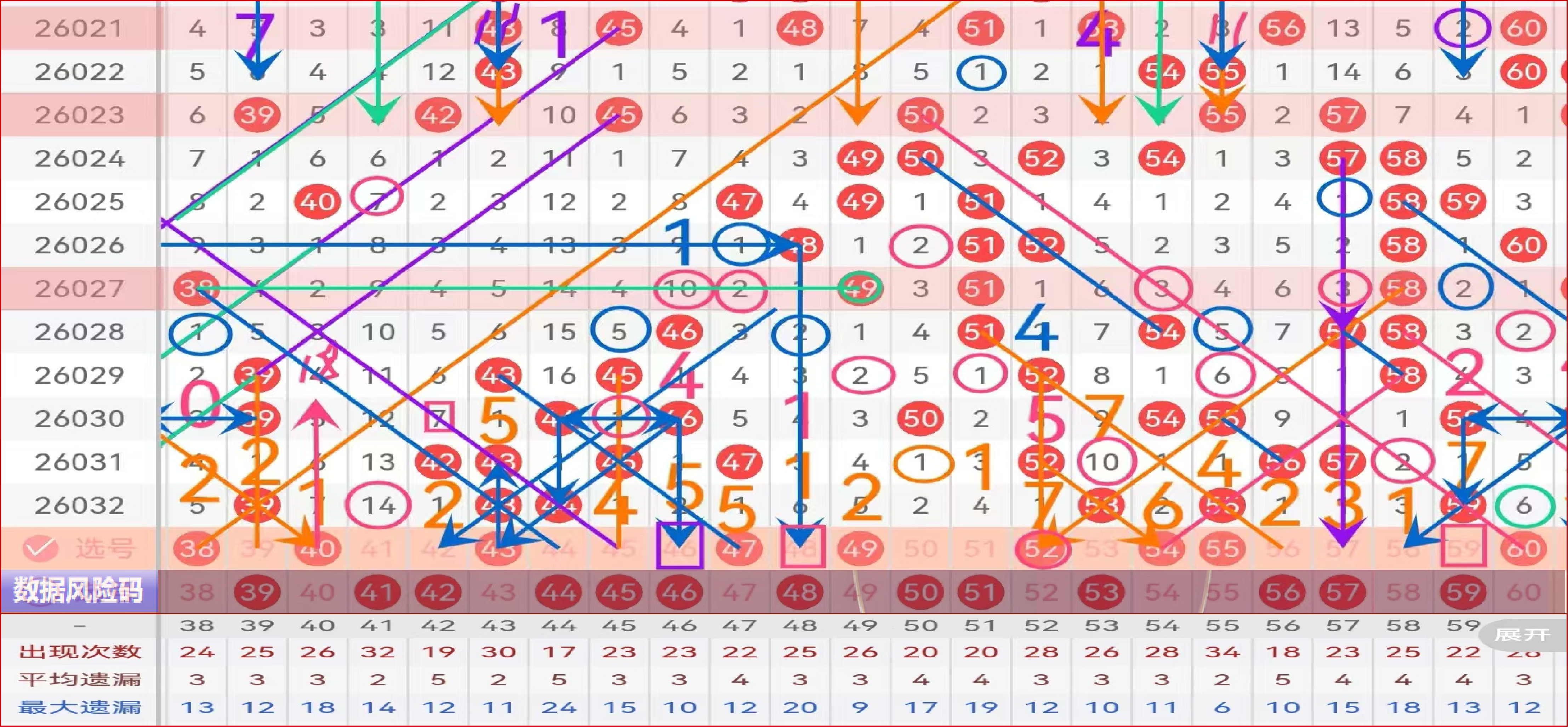 三区间上期出了5个号码,均值开出,43 44这里还是仿形态做43三重,具备数据属性;44 45 46风险码;47杠杆斜连码,第六次走遗漏1点位,可考虑区间中部的孤码回补号码球;49高数据,第三次走遗漏5,这里的38 49是本期不错的同遗漏连号组合,38 49本期可两码同拿做号,或做复式码;5字头三码52 54 55需重点关注,这里的三码三择一推荐叠号55主做,52 54也是非常不错的复式码;尾部60可重点关注,60比较遗憾的是没有走过遗漏6的属性,高分边属性是这个号码球不能放弃的理由,如果59走重,60本期就应该没有,可选择性做号;