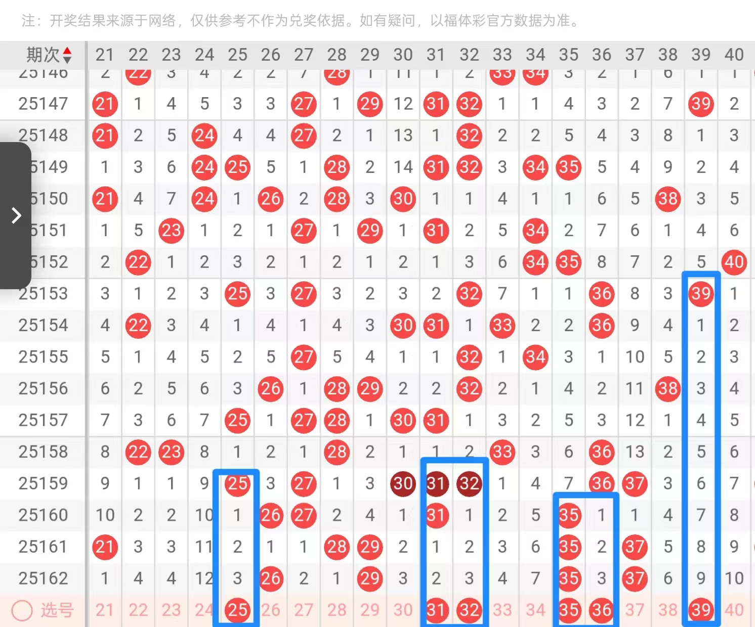 二区21—40:上期二区开奖呈现温和态势共回补五个号码。观察本期走势龙头位置的20。按照我们的形态规律20开了要考虑20与50的同开或者选一码,所以说本期的20做重也是一个不错的选择。在3字头号码区域,31号与32号存在较大回补可能性,其斜连顺位出现的趋势较为明显。此外35号与37号同处一个区间,均展现出较高的重复开出概率。相较之下个人更看好35号形成四重形态,并与36号同时现身不过需要再次强调。重码的风险较大定主胆需要好好思考。