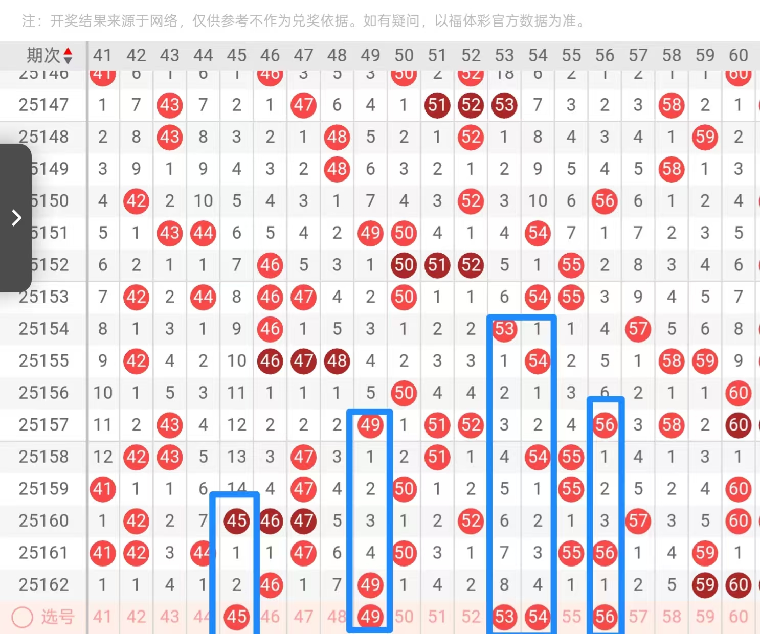 三区41—60:上期三区号码形态走势出现显著变化,此前持续火热的局面骤然转冷。基于此本期在龙头位置的选号上,42、44号近期表现活跃值得重点关注。个人更倾向于47号若开出其直连转斜连形态可能会带动45号一同出现。不过该区域其余号码因走势尚不明朗建议持谨慎态度分析判断。另外49号的重号态势是有一定的关联。在5字头号码区间从号码间隔规律分析53号与54号中或有一码实现回补;同时从对子空一的形态角度考量不排除54 56的同开以及56 58的同开。