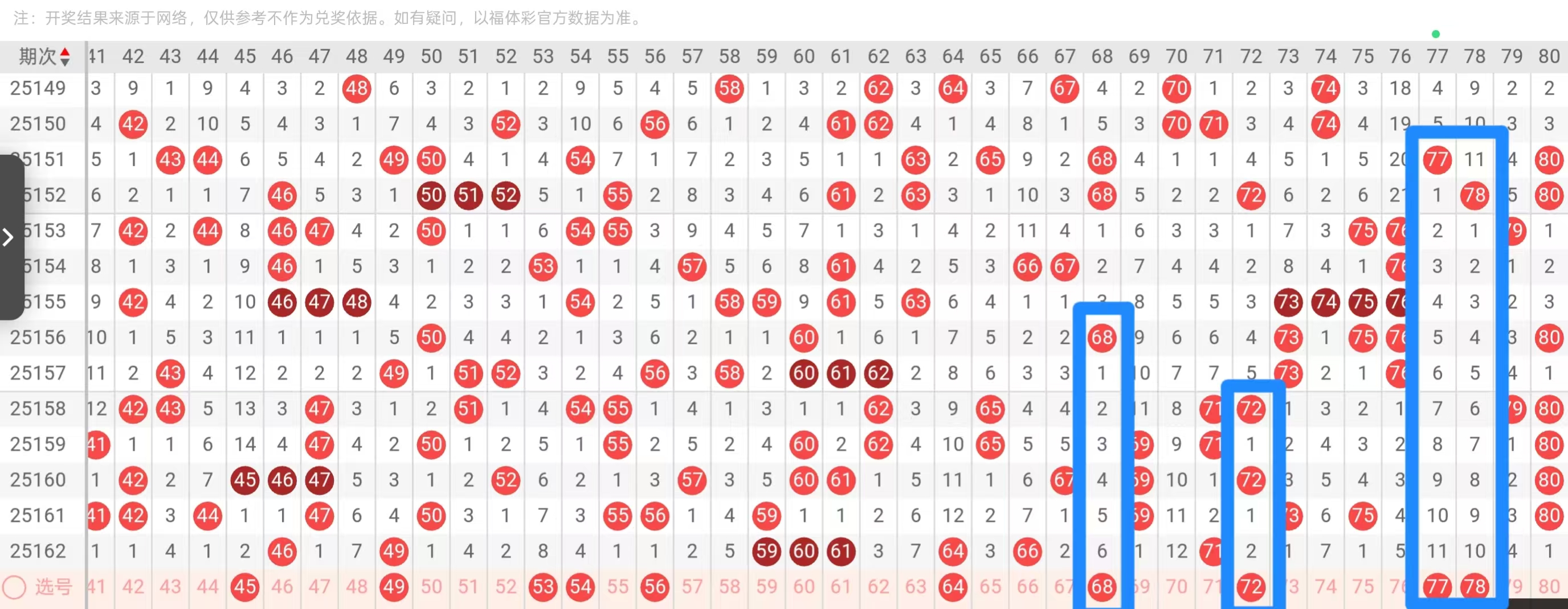 四区61—80:上期四区开奖中号码分布呈现出明显特征:仅在6字头区域形成了较为集中的号码分布态势并且在龙头位置开出连号。从走势分析来看61号与上期连号62号形态相似。64与66之间选择大遗漏号码进行关注或许是一个可行思路,不过这部分号码建议仅作辅助参考不宜作为核心胆码。再看7字头区域根据历史走势规律本期有望迎来号码回补。其中77号当前处于全盘唯一11期遗漏状态值得重点留意;而龙头附近的72、73号当前遗漏值分别为1和2,从连号卡位角度分析具备一定的出现概率。