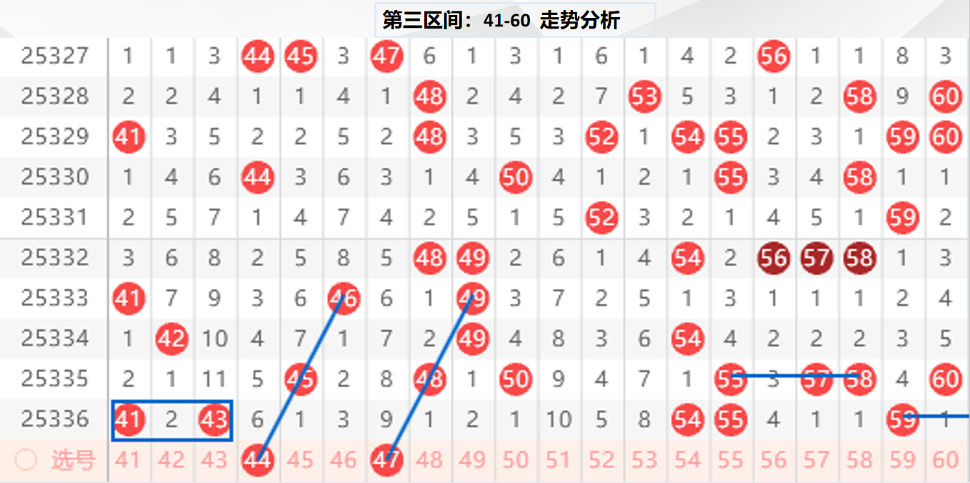 三区分析:【41-60】(走势图标注号码非小黄车大底,请谨慎参考,具体思路将在直播间分享讨论)