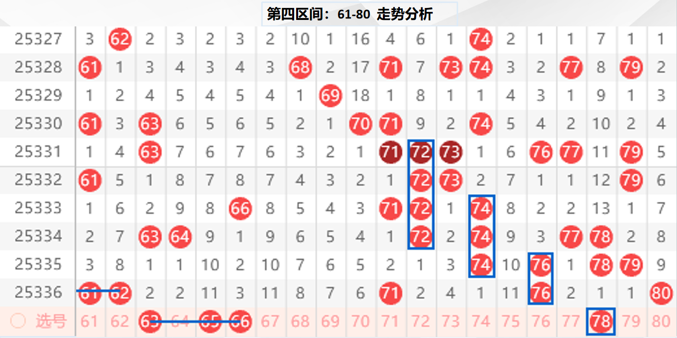 四区分析:【61-80】(走势图标注号码非小黄车大底,请谨慎参考,具体思路将在直播间分享讨论)