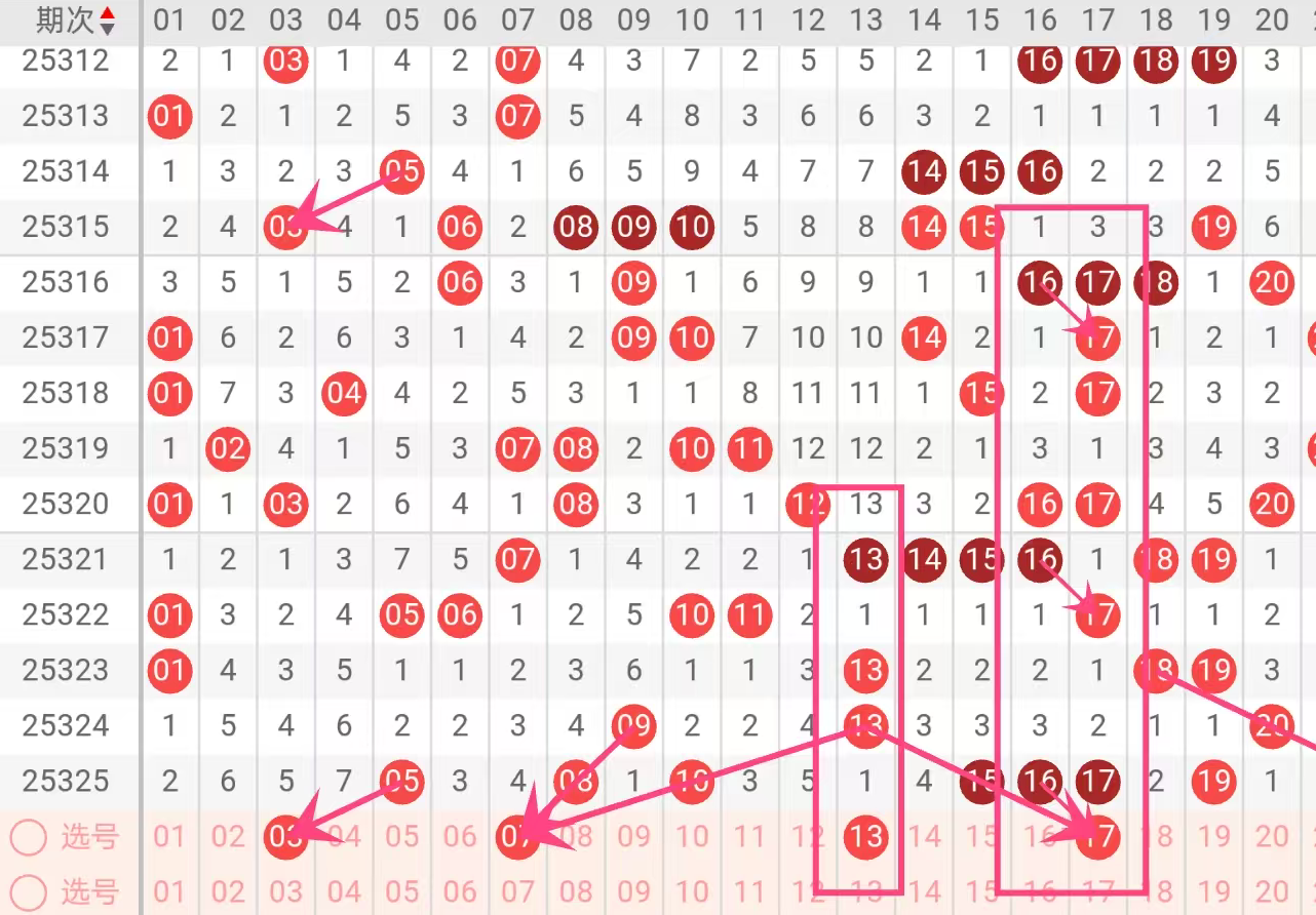 17(322期、325期开出)节奏呈“322期开出→323期休整→324期休整→325期回补”的精准对称周期模型。该号走势规整,在完成一个完整的两期休整周期后准时回补,体现了稳定的波动节奏,续出概率提升。
