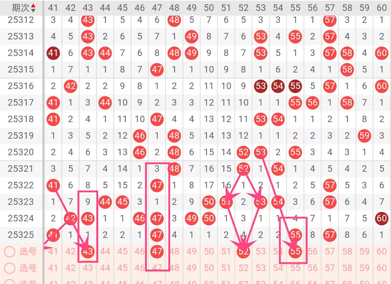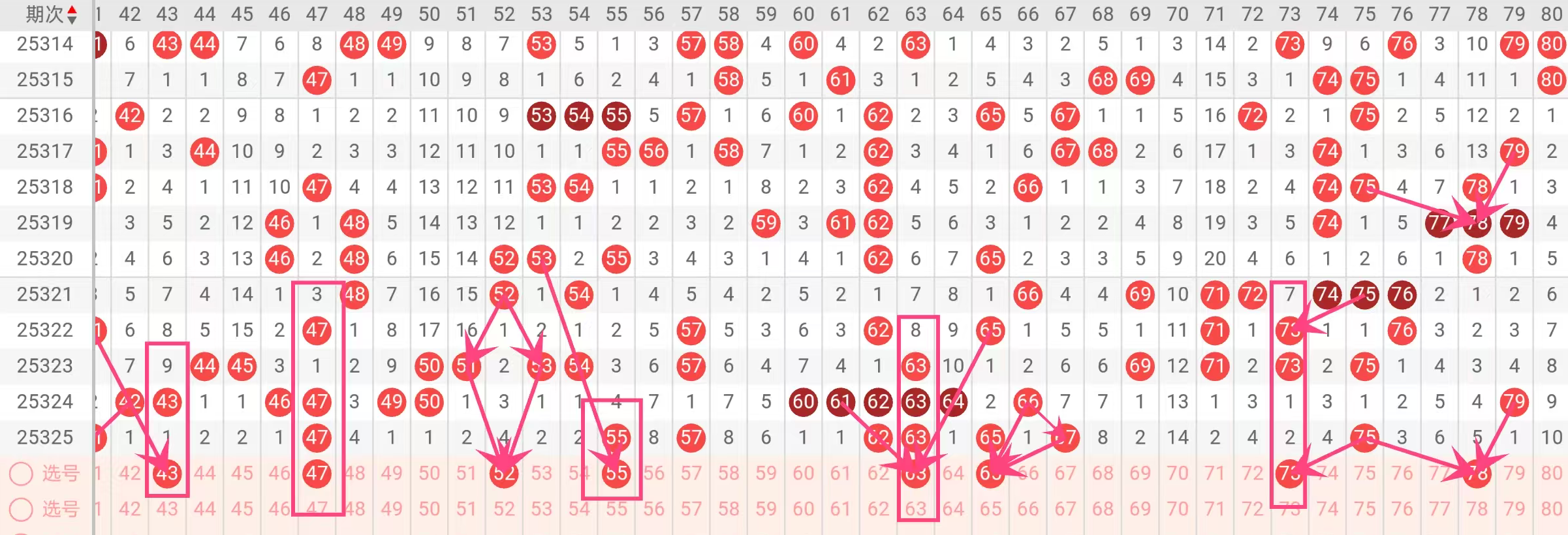 47(322期、324期、325期开出)节奏呈“322期开出→323期休整→324期回补→325期续热”的阶梯式上攻模型。该号走势展现出明确的加速态势。在经历一期标准休整后,能于324、325期实现连续开出,这种模式是短期势能强劲攀升的标志,热态续出态势强烈。