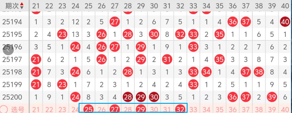 第二区间的走势分析:第二区间上期开出了七个号码球!主要的落号点位在二区间前后半区的凤尾位置,走出了三奇四偶的形态。上期龙头开出了24,凤尾开出了39,根据二区间的走势规律!今天的二区间前半区主看龙头25,因为25走出了斜连码也是热码的回补,凤尾主看32,形成了一个特殊图形的形态。再看27 29组合的落位!也是25 27 29热组合的号码!大家参考!