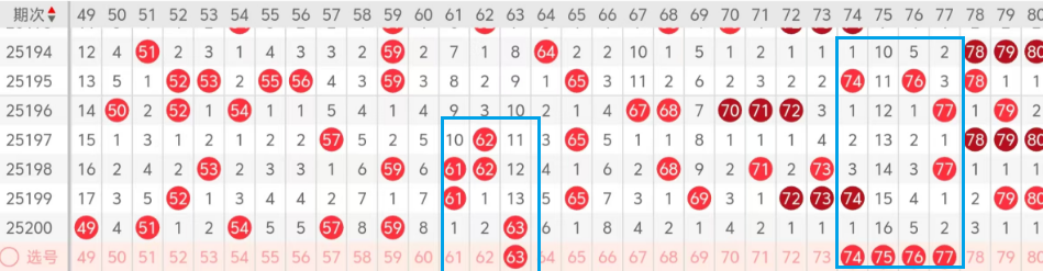 第四区间的走势分析:第四区间上期开出了一个号码球!主要的落好点位在四区间前半区的龙头位置,走重了一奇的形态.上期开出了龙头63,直接杀区段的号码!今天龙头我们还看63这个号码球!简单明了,和61 62形成了同形太!再看后半区冷码位置上方空区段的地方!74 75 76 77这几个号码球的落位!今天这里至少有一码落下!四区间今天回补号码应该有所增加!但是不会太多!落号应该比较分散。