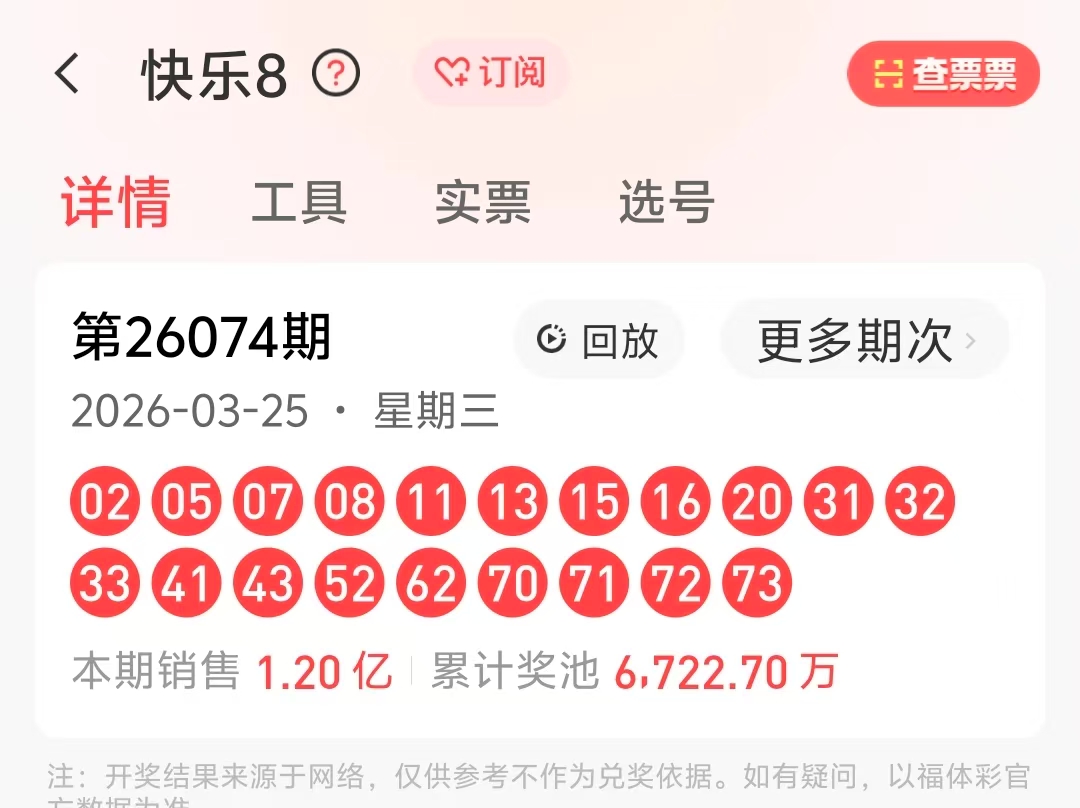26074期 开出了2-5-7-8-11-13-15-16-20-31-32-33-41-43-52-62-70-71-72-73