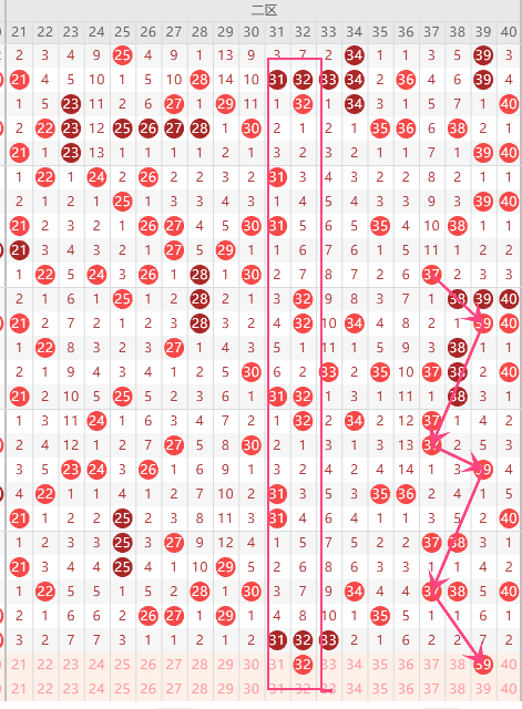 第二区间的走势分析:第二区间上期开出了3个号码球,前半区3个,属于3连码。根据二区间的走势规律,今天的二区间我们主看半区37的回补,走出了上下对称的走势形态,再看二区间前区位置32这个号码球的落位,重点关注32-37组合