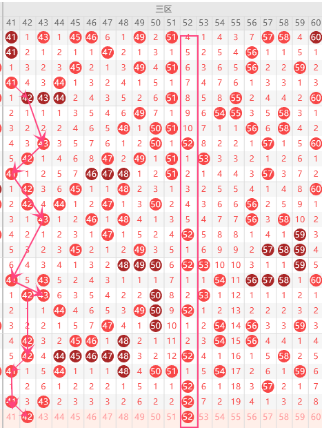 第三区间的走势分析:第三区间上期开出了3个号码球,主要的落号点位在三区间的半区,走出了2奇的形态走势,后半区落下了1个号码球,根据三区间的走势规律,今天的三区间我们主看半区位置41组合的落位,41走出了连期对称的走势,重点关注42-52组合这个号码球的落位