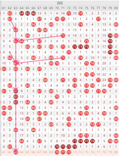 第四区间(61-80)第四区间的走势分析:第四区间上期开出了5个号码球,主要的落号点位在四区间的后半区,走出了22偶的形态走势,上期四区间的半区落下了4个号码球,整个四区间处于靠前的趋势,根据四区间的走势规律,今天的四区间我们主看半区62这个号码球的落位,根据以往62的落球规律。重点关注63-71组合