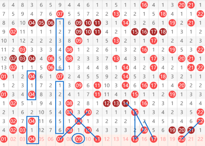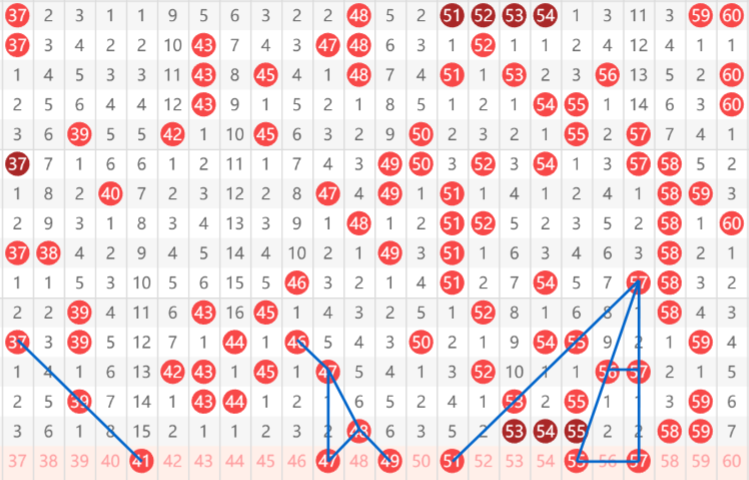 最近的第一个号码41,大家看到37间隔一期给出39,再间隔一期给出41的走势,同时41又是近期最大的一个遗漏,15期有望开出,然后就是47号以及49号,这是一个二选一的号码,再往后就是53号。大家看到从57~53的间隔一斜连。账户就是55号看重,然后和上面的57形成了一个三角形的走势。