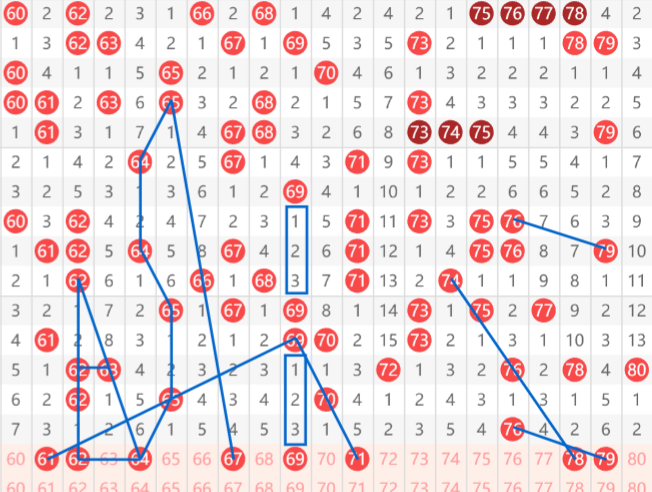 快乐8第2026034期61-80区域的推荐如上图,最后一个区推荐接下来是第一号码61,有一个间隔对称走势,大家可以看到间隔3,间隔2,然后再间隔3,然后就是62和64,这里有一个三角形的走势,如图所示。同时64和65之间的关系,大家可以看到他们走的是非常对称的。然后就是67号一个大的斜连;65间隔五期开出了66,再间隔5期开出67的走势;下来就是69上下间隔3的对称走势,以及旁边的71一个间隔一三斜连。最后就是78和79这两个号码,78有一个间隔斜连79是考虑76带出,79近期的走势比较多,大家可以查看走势图,每当76开出之后,下一期会开出79。
