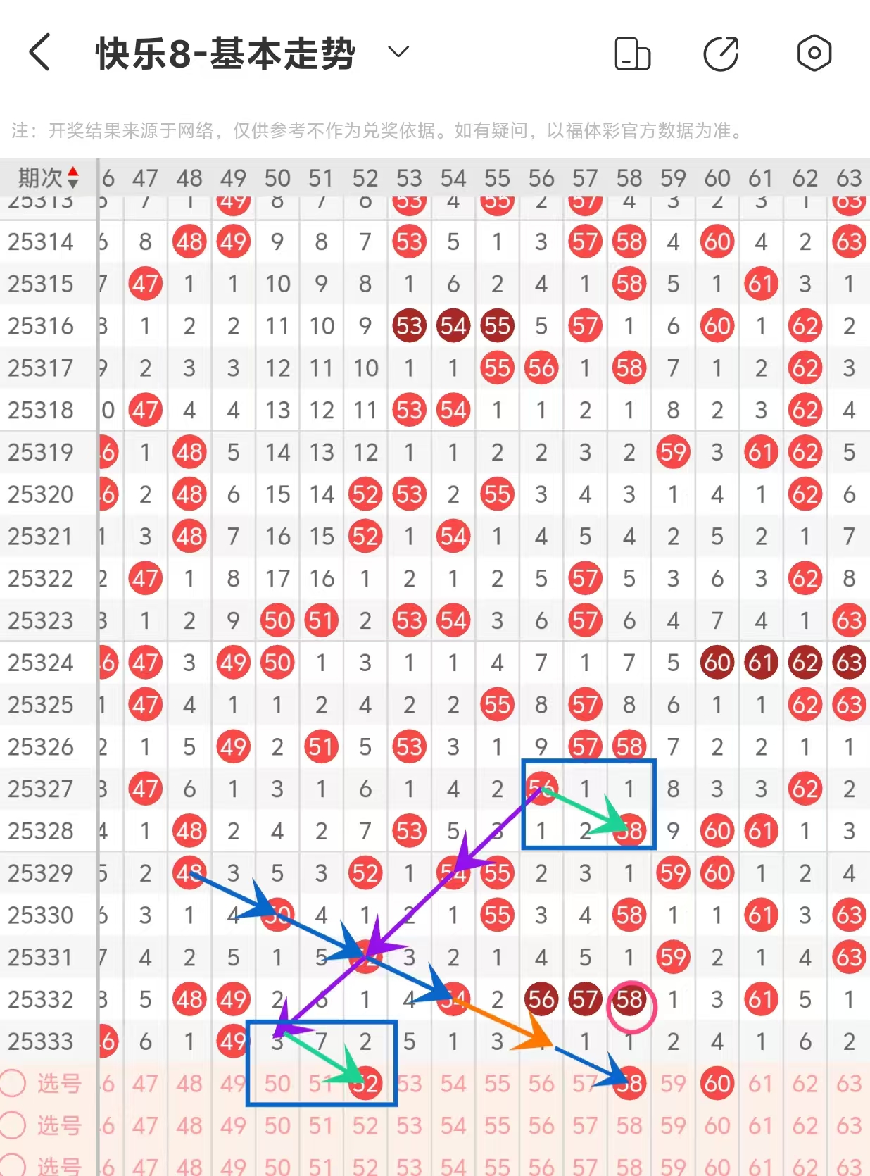 上图我们看到蓝色箭头48,50,52,54还挺有规律的,只是上期的56没开出,假设上期56是开出的情况下,这一期按规律来就是连58,60是防一手58不来的情况,所以就选上60了,上面蓝色小长方形里56斜空连58的规律对应着紫色箭头下来的空格子50斜空连52(假设50在上期开了,这样子看就有规律可言)
