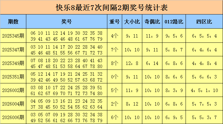 福彩快乐8第2026006期开出奖号:03 05 07 09 19 28 30 32 34 38 49 52 56 61 62 66 73 76 78 79,其中奖号奇偶比为9:11,大小比为10:10,012路比为5:10:5,四区比为5:5:3:7,包含5个重号07、09、49、56、76。