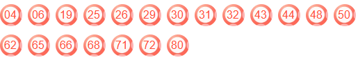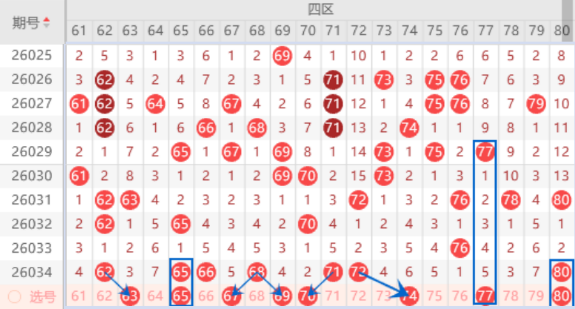 该区间的63 64号数字我们注意一下出号情况,本期这里是有机会出一个号码的。上期开出了65 66 68 71 72号数字,本期我们注意一下出重号的情况,其中的65 68 72号数字可以重点关注一下出重号的情况。本期的67号数字我们注意一下出号情况,本期可以防守一下67 69号数字同出的情况。本期的74号数字出号机会也是有的,我们可以关注一下34 74号数字同出的情况。本期的77号数字属于595走势,出号机会也是有的,我们可以防守一下77 80号数字同出的情况。