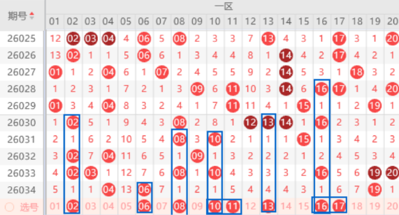 该区间的02 08 10号数字是属于空一对称号码,出一个号码的机会是有的,我们可以关注一下08 10号数字的出号情况。本期的11号数字是属于空五对称号码,出号机会是有的,我们可以关注一下出号情况。本期的12 13 14号数字已经断号4期了,本期是有机会出号的,我们可以关注一下出号情况,其中的12 13号数字可以重点关注一下出号情况。本期的16号数字是属于121走势,出号机会是有的,我们可以关注一下出号情况,本期可以防守一下16 17号数字同出的情况。
