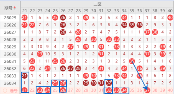 该区间21号数字我们注意一下出号情况,本期可以防守一下21 24号数字同出的情况。上期开出了25 26号数字,本期我们注意一下出重号的情况,其中的26号数字可以重点关注一下。上期开出了四连号29 30 31 32号数字,本期我们注意一下出重号的情况,其中的31 32号数字我们可以重点关注一下。连号空一代号33 34 36号数字,本期我们注意落下一个号码的情况期,其中的33 34号数字我们可以重点关注一下。本期的37号数字出号机会也是有的,我们可以关注一下。