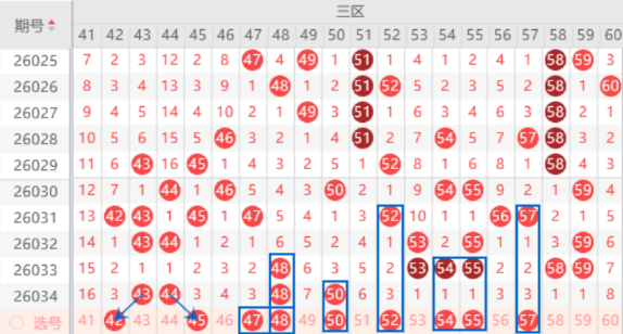该区间上期开出了42 43号数字,本期我们注意一下走分边的情况,所有本期的42 45号数字我们注意一下出号情况。本期的48号数字我们防守一下走三重的情况,本期可以防守一下48 52号数字同出的情况。三连号53 54 55号数字上期没能开出重号来,本期我们注意一下落下一个号码的情况,其中的54 55号数字可以重点关注一下出号情况。本期的57号数字是属于323走势,出号机会也是有的,我们可以关注一下出号情况。