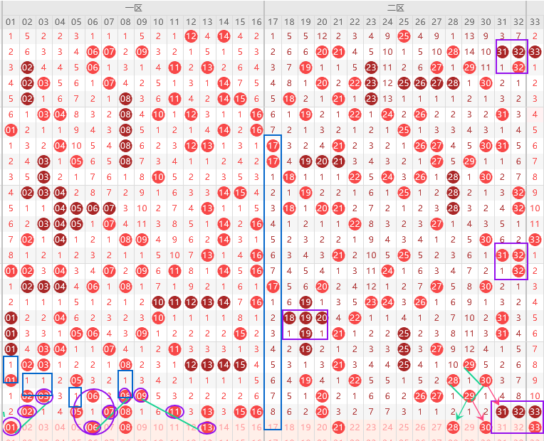 二区胆尾8尾0尾,看好出3-4码,边号19 21 30三出一,重号20 31 32出一码,看上图勾画上期31是29 30出完正点位三斜连不出,隔一期出,那么本期30跟上面一样隔一期出,看图,28也是属于30 29出完隔一期出28,本期可以防守一期,看上图勾画,三连号下面一直有重号,而且31 32连号下一期出重,那么本期31 32 33三出一大概率会重一码,0尾出三期,热尾可以跟20 30二出一,本期20有机会出三重号,17上期正点位没出,可以守一期,结论关注五码19  20 28 30 31,防21,一胆19 双胆19 20