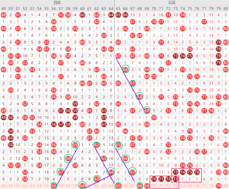 四区胆尾6尾1尾,边号51 53 61 63出一码,防重号52 62,形态上56 60是斜连号,上图已勾画,这个区太冷了打的人太多,应该出2-4码内,不建议多选,走热再跟,结论关注五码53 56 60 61 63 防49,一胆56 双胆56 61