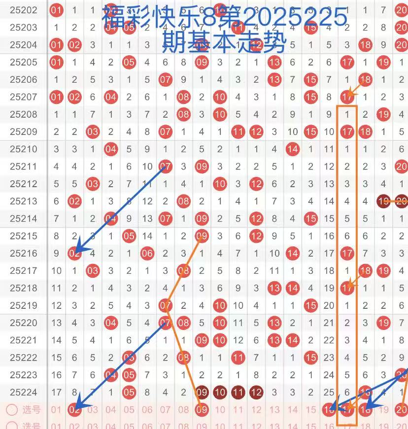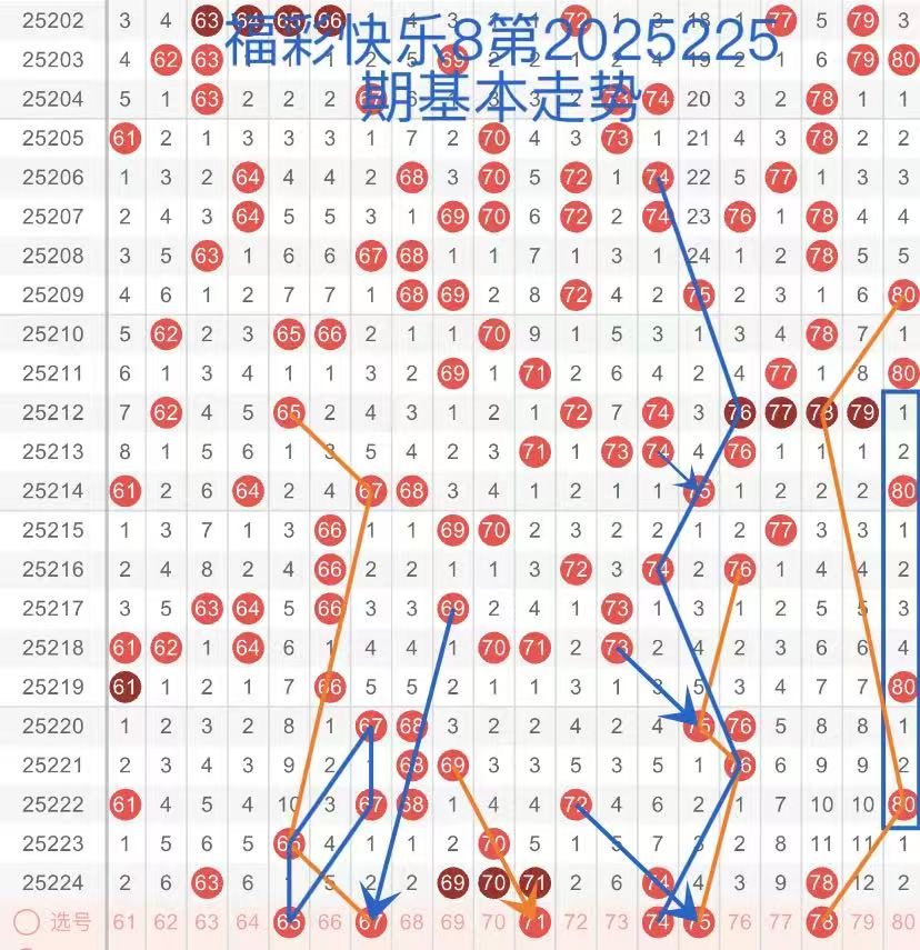 下面是我对2025225期福彩快乐8的分析和预判,希望通过我的分析能让大家今晚大满贯!福彩快乐8上期开奖号码如下图