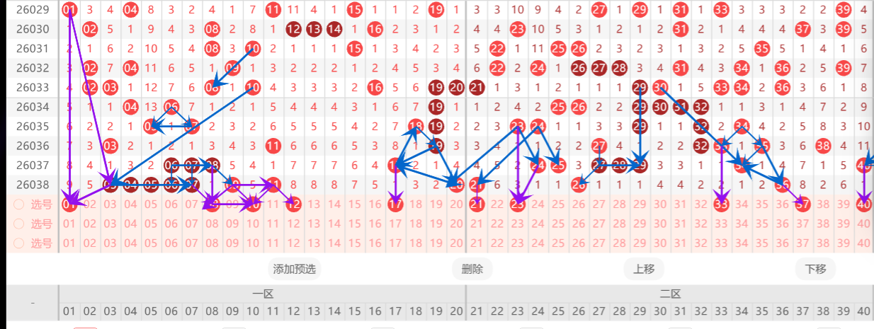 第二:需要重点本区间奇数偶数搭配的号码,需要重点关注:21/23/33/37/40这几个号码会出现3-4个号码。