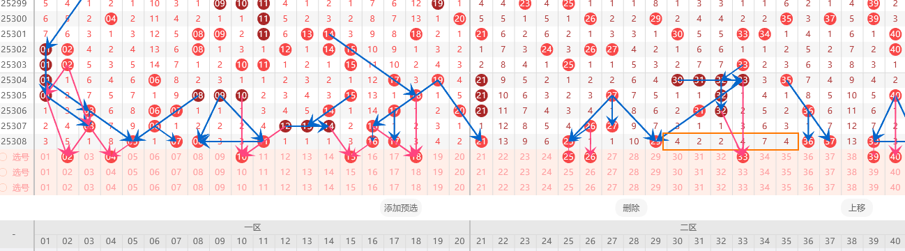 第二:需要重点本区间奇数偶数搭配的号码你,需要重点关注25/26/27//33/39/40这几个号码会出现2-4个号码。