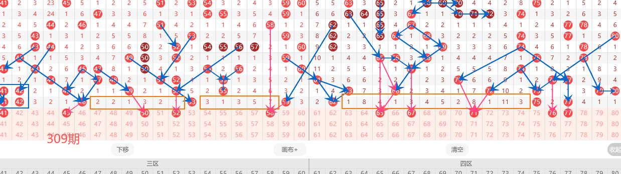 第一:根据整体走势来看本期第四区间的热度应该还会持续上升,可以把重点放在65-80这个小区间进行选号。