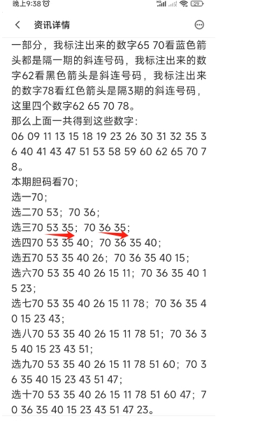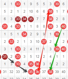 上图是福彩快乐8开奖号码走势分布图其中一部分,我标注出来的数字35看黑色小箭头是跨度二斜连号码,我标注出来的数字36看红色箭头是隔3期的斜连号码,我标注出来的数字38看绿色箭头是隔两期斜连号码,这里三个数字35 36 38。