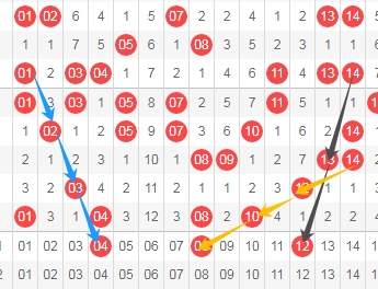 上图是福彩快乐8开奖号码走势分布图其中一部分,我标注出来的数字04看蓝色小箭头是隔一期的斜连号码,我标注出来的数字12看黑色小箭头是隔两期的斜连号码,我标注出来的数字08看黄色箭头是跨度二斜连号码,这里三个数字04 08 12。