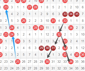 上图是福彩快乐8开奖号码走势分布图其中一部分,我标注出来的数字25看蓝色箭头是隔三期的斜连号码,我标注出来的数字30 34看黑色小箭头是隔一期的斜连号码,这里三个数字25 30 34。