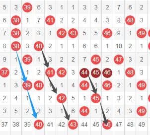 上图是福彩快乐8开奖号码走势分布图其中一部分,我标注出来的数字40看蓝色箭头是隔两期的斜连号码,我标注出来的数字43 46看黑色小箭头是隔一期的斜连号码,这里三个数字40 43 46。
