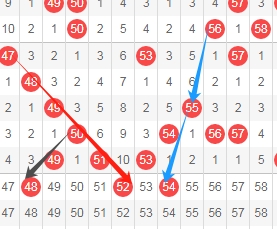 上图是福彩快乐8开奖号码走势分布图其中一部分,我标注出来的数字48看黑色小箭头是斜连号码,我标注出来的数字52看红色箭头是斜连号码,我标注出来的数字54看蓝色小箭头是隔两期的斜连号码,这里三个数字48 52 54。