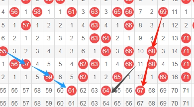 上图是福彩快乐8开奖号码走势分布图其中一部分,我标注出来的数字61看蓝色箭头是跨度二斜连号码,我标注出来的数字67看红色箭头是隔两期的斜连号码,我标注出来的数字64看黑色小箭头是斜连号码,这里三个数字61 64 67。