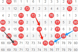 上图是福彩快乐8开奖号码走势分布图其中一部分,我标注出来的数字70看黑色小箭头是斜连号码,我标注出来的数字75看红色箭头是隔一期斜连号码,我标注出来的数字76看蓝色箭头是跨度二斜连号码,这里三个数字70 75 76。