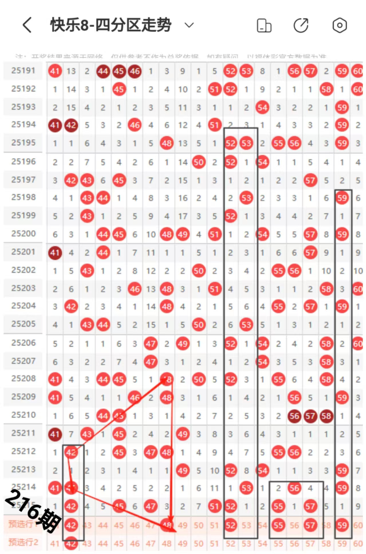 咱们每期都要养成开奖后对开奖号的走势复盘的,核对今天的奖号和自己今天的号码分析的走势有哪些出入,每天核对,总结出自己看号的出入问题和开奖号下落的走势形态的规律。特别是近两三天出号的规律,基本都是可以延用的,同一走势形态规律,不要连着追第四期。咱们重点关注咱们奖号的重号,顺子号码,加减规律号码等。重号和顺子这两个指标是咱们每期都需要重点关注的。重号的比例经常都在百分之二三十的概率的,特别适合咱们玩选二选三的选手!咱们上期重号开出了:09 12 25 31 42 顺子号开出了:52 42 24。总共7个号码,开奖号数量占比35%。本期这个比例咱们是继续看走增长的趋势。