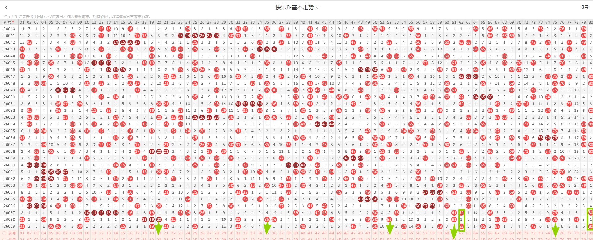 从这张走势图可以看到绿色方框标出来了遗漏一期的示意号码,开出了隔期(遗漏一期的)2个号码(绿色方块标示的),数量与上期一致,从近期走势图看隔期码回温态势形成,本期判断热度继续回温,落号5个号码概率较大(绿色箭头标示的20、35、52、61、75)需要关注,有下号概率;