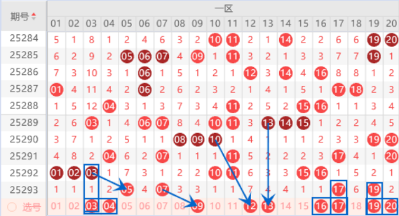 该区间上期的三连号01 02 03号数字没能开出重号来,本期我们注意一下落下一个号码的情况,其中的03号数字我们可以重点关注一下,本期的04号数字是属于空二对称号码,出号机会是有的,我们可以防守一下03 04号数字同出的情况。本期的12号数字是属于斜连号码,出号机会也是有的,我们防守一下12 13号数字同出的情况。上期开出了17 19号数字,本期我们注意一下出一个重号的情况,本期可以防守一下16 17号数字或者19 20号数字同出的情况。