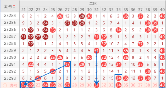 该区间的21号数字是属于四斜连号码,本期我们注意一下出号情况,本期可以防守一下21 22号数字同出的情况。本期的25号数字是属于空一对称号码,本期出号机会也是有的,我们可以防守一下24 25号数字同出的情况。本期的27 29号数字我们注意一下落下一个号码的情况,本期可以防守一下27 33或者29 33号数字同出的情况。上期开出了34 35 37 38号数字,本期我们注意一下出一个重号的情况,其中的34 37号数字我们可以重点关注一下。