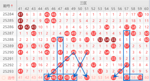该区间的45号数字是属于斜五连号码,本期出号机会是有的,我们可以关注一下出号情况,本期可以防守一下45 46号数字同出的情况。本期的47号数字是属于空一对称号码,本期防守一下出号情况。本期的49 51号数字是属于交叉对称号码,是有机会出一个号码的,我们可以重点关注一下。本期的54 55号数字都是属于斜三斜连号码,本期我们防守一下出一个号码的情况。本期的43 57号数字都是属于121走势,本期也是要防守出一个号码的情况。
